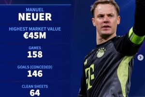 德转也列出了诺伊尔(巅峰身价4500万欧元)欧冠生涯关键数据:出战158场,丢146球,完成64次零封,平均每93分钟丢1球。